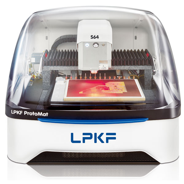 Das Basissystem für fast alle Anwendungen des Inhouse-PCB-Prototypings: Der ProtoMat S64 überzeugt mit Geschwindigkeit und Zuverlässigkeit. Die hohe Drehzahl der wartungsarmen Frässpindel gewährleistet die Fertigung von feinen Strukturen bis zu 100 μm und erlaubt die Herstellung von Multilayern. Die umfangreiche Ausstattung macht den ProtoMat S64 zur perfekten Ergänzung jeder Entwicklungsumgebung, inklusive Dispenser und Vakuumtisch.