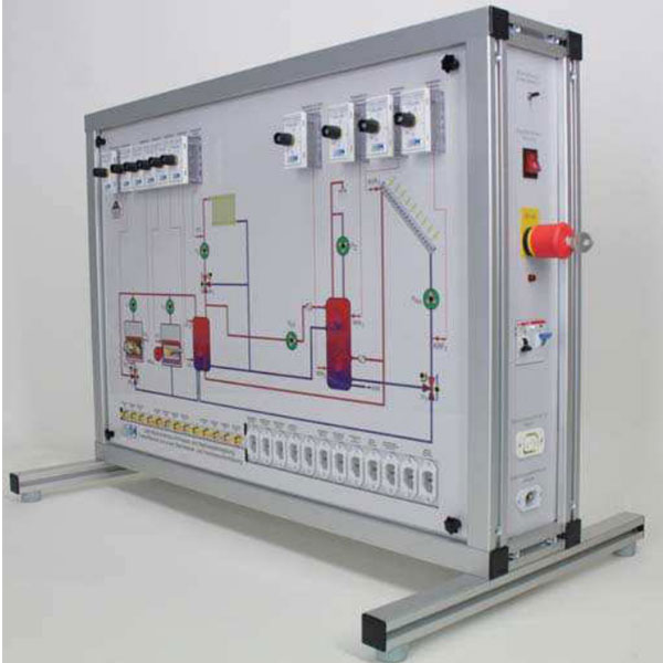Gerätebeschreibung:Die jeweiligen Heizungs-Systemdarstellungen befinden sich auf 6 unterschiedlichen Wechselplatten, die mit einer Schnellbefestigung auf dem Grundrahmen des Kompaktmodells befestigt werden können. Gerade nicht benötigte Wechselplatten werden platzsparend auf der Rückseite des Modells untergebracht.Bei der Darstellung der Heizungskreisläufe wurde besonders darauf geachtet, dass deren Wirkschema leicht nachvollzogen werden kann.Innerhalb des Grundrahmens sind Leuchtmelder (Heizkessel, Pumpen, Mischer), Anschlussbuchsen für Sensoren und Stellglieder an den Heizungsregler und Steckplätze für die Temperaturfühlersimulation eingebaut.Abhängig davon, welche Wechselplatte gerade für die Reglerinbetriebnahme verwendet wird, werden jeweils nur die benötigten Leuchtmelder und Temperaturfühler-Steckplätze freigegeben.Die Anschlussbuchsen (Sensoren/Stellglieder) vom Modell zum Heizungsregler sind systemspezifisch auf den Wechselplatten beschriftet.Dies gewährleistet eine leichte Zuordnung der Heizungsanlagenkomponenten an den jeweils verwendeten Regler.Für die Temperaturfühlersimulation (z.B. Vorlauf-, Speicher-, Außen- und Solarfühler) werden 12 Steckpotentiometer mit Temperaturskala und 1 Anlegetemperaturfühler (Vorlauftemperaturbegrenzer Fußbodenheizung) verwendet.Die Fühler werden nach Vorgabe des Kunden an ggf. vorhandene Regler (z.B. Vaillant, Viessmann, Buderus, usw.) angepasst.Der Anschluss der Sensoren und Stellglieder an den jeweiligen Heizungsregler erfolgt mit vorkonfektionierten Kabeln.Eine Seite des Kabels verfügt über den passenden Stecker für die Steckbuchse am Schulungsmodell, die andere Kabelseite kann direkt auf die Anschlussklemmen des Reglers gelegt werden.Um die elektrische Sicherheit zu gewährleisten, ist das Schulungsmodell mit einem eigenen Sicherungsblock und FI-Schutzschalter ausgestattet.Die Spannungsfreigabe für den angeschlossenen Heizungsregler erfolgt über einen Schlüsselschalter. So kann der Ausbilder z.B. erst nach einer Überprüfung der Verdrahtung die Betriebsspannung freigeben.Optional bieten wir als empfohlenes Zubehör (wenn kundenseitig kein Regler vorhanden ist) einen universellen Heizungsregler (Honeywell SDC 12-31) an. Dieser Regler eignet sich besonders für die solare Wärmeerzeugung einschließlich solarer Heizkreisunterstützung und für die Erklärung parametrierbarer Regler, die an die unterschiedlichsten Heizungssysteme angepasst werden können.