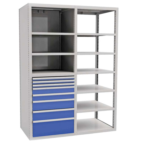 Durch Kombination von Schwerlastregalen, Schubladenteilen etc. können sehr viele Kombinationsmöglichkeiten verwirklicht werden