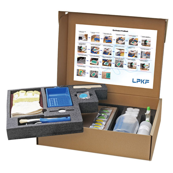 Die Lötstoppmaske wird aus dem CAD-Programm auf eine Transparentfolie gedruckt, auf die Leiterplatte übertragen und entwickelt. In nur vier Arbeitsschritten erhält die strukturierte Leiterplatte in wenigen Minuten ein perfektes Oberflächen-Finish für ein Löten ohne Kurzschlüsse.