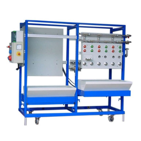 Der Prüfstand wird standardmäßig mit 2 eingebauten Druchflussturbinen geliefert, die über einen Datenlogger ausgewertet werden können. Datenlogger und weitere Messtechniken sind verfügbar, jedoch nicht im Standard Lieferumfang enthalten. Er verfügt über einen integrierten Wasserabfluss. Die Wasserauffangbecken sind in der Höhe einstellbar und auf Rollschienen montiert.