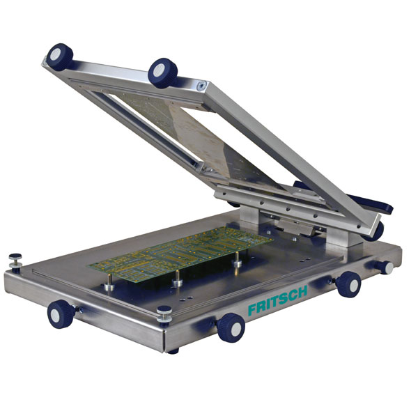 Mit dem Basismodell werden einseitige Leiterplatten bedruckt. Dazu werden die Leiterplatten auf die Grundplatte aufgelegt und mechanisch fixiert. Mittels Drehknöpfen kann die Druckausrichtung in X-Y und Theta Achse schnell und einfach vorgenommen werden. Ein Prallelhub sorgt für ein sauberes Trennen von Leiterplatte und Schablone und garantiert ein einwandfreies Druckbild.Für die Aufnahme von Schablonen stehen drei Varianten zur Verfügung.Eine Aufnahmeschiene für die Verwendung von festen Aluminiumrahmen bzw. gängiger Schnellspannsysteme.Für einfachst Aufgaben gibt es den universellen Schablonenhalterrahmen in den die Schablonenbleche ohne Spannung einfach geklemmt werden (903.203).Optimal ist die Verwendung des universalen Schablonenspannrahmens (903.204). Hier können die verschiedensten Schablonengrößen eingesetzt werden. Das Spannen erfolgt von zwei Seiten und es ist keine Lochung zur Aufnahme notwendig.Für doppelseitiges Bedrucken fixiert man die Leiterplatte mit den Magnet-Leiterplattenhaltern (notwendig bei der Verwendung des universalen Schablonenspannrahmens).Technische Daten: