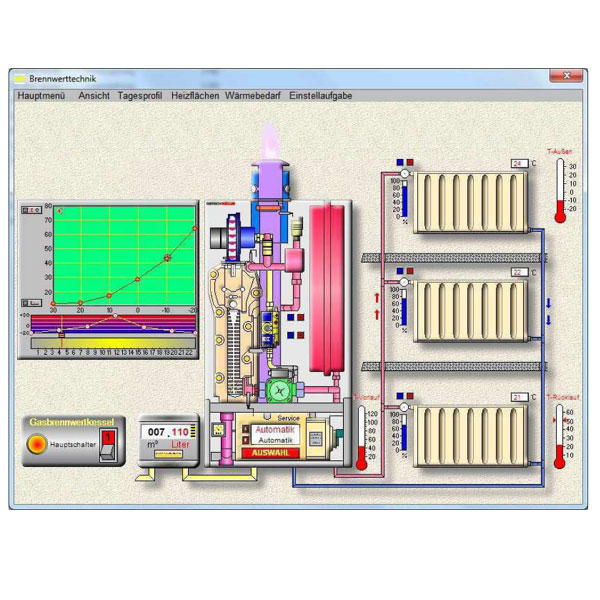 Programmbeschreibung:Das Simulationsprogramm "Gas-Brennwerttechnik" ermöglicht die Durchführung von Inbetriebnahme-Einstellübungen direkt am PC und vermittelt die Grundzusammenhänge der Brennereinstellung (Gasverhältnisventil) und der Bestimmung des Betriebspunktes des Anlage (Heizkennlinie, Rücklauftemperatur, Abgastaupunkt).Für die messtechnische Erfassung der Abgaswerte ist ein Abgasmeßgerät (CO2, O2, Abgastemperatur, usw.) und für den Gasdurchsatz ein Gasmengenzähler vorhanden.